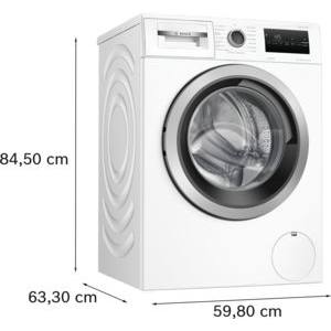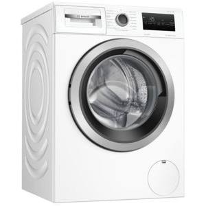 Weiße Waschmaschine von Bosch, Frontansicht. Rundes Bullauge, Bedienfeld mit Drehregler und digitaler Anzeige.